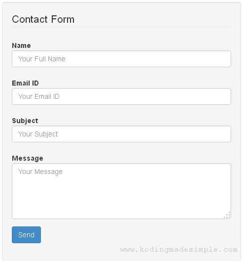 Next we have to create view file for codeigniter contact form. Create a file named “contact_form_view.php” inside application >> views folder. This file will holds up the html markup mixed with bootstrap css classes to render the form. Using the bootstrap form classes will properly align the form elements with required padding. Here is the complete markup for our contact form.